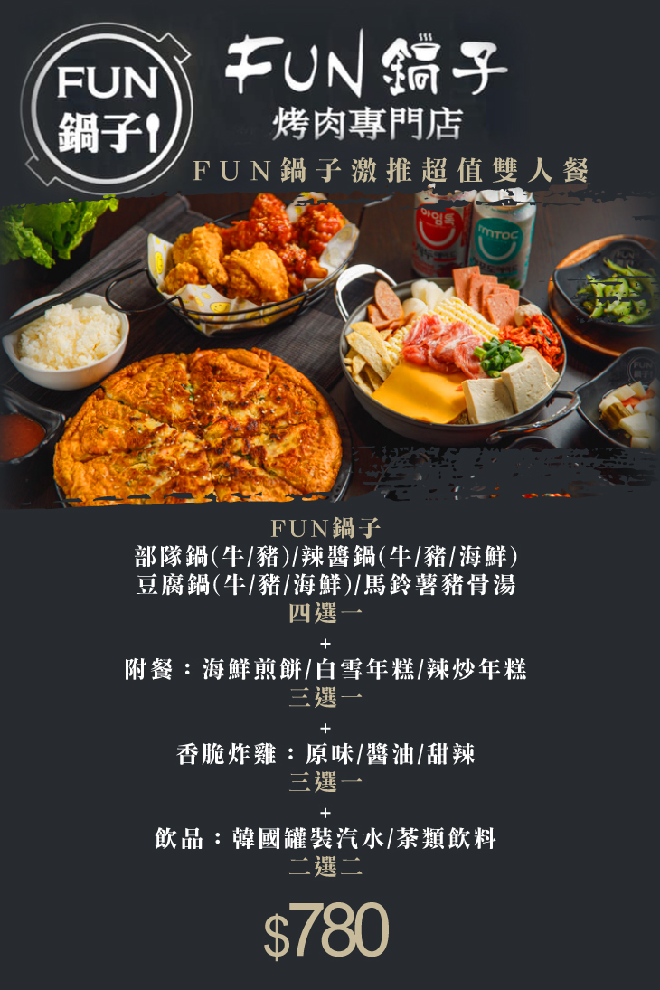 【FUN鍋子】一聽之下是火鍋店,其實~可沒有這麼簡單唷!主打韓式料理的【FUN鍋子】,主打深受青睞的韓式鍋物、韓式烤肉,搭配道地的韓式佳餚,為您獻上香氣十足、口味正宗的韓式宴席!哈韓的朋友們,絕對不能錯過這可以一嚐美味餐食的機會~今天就相揪同樣熱愛韓國文化的朋友,一同來聚餐吧!