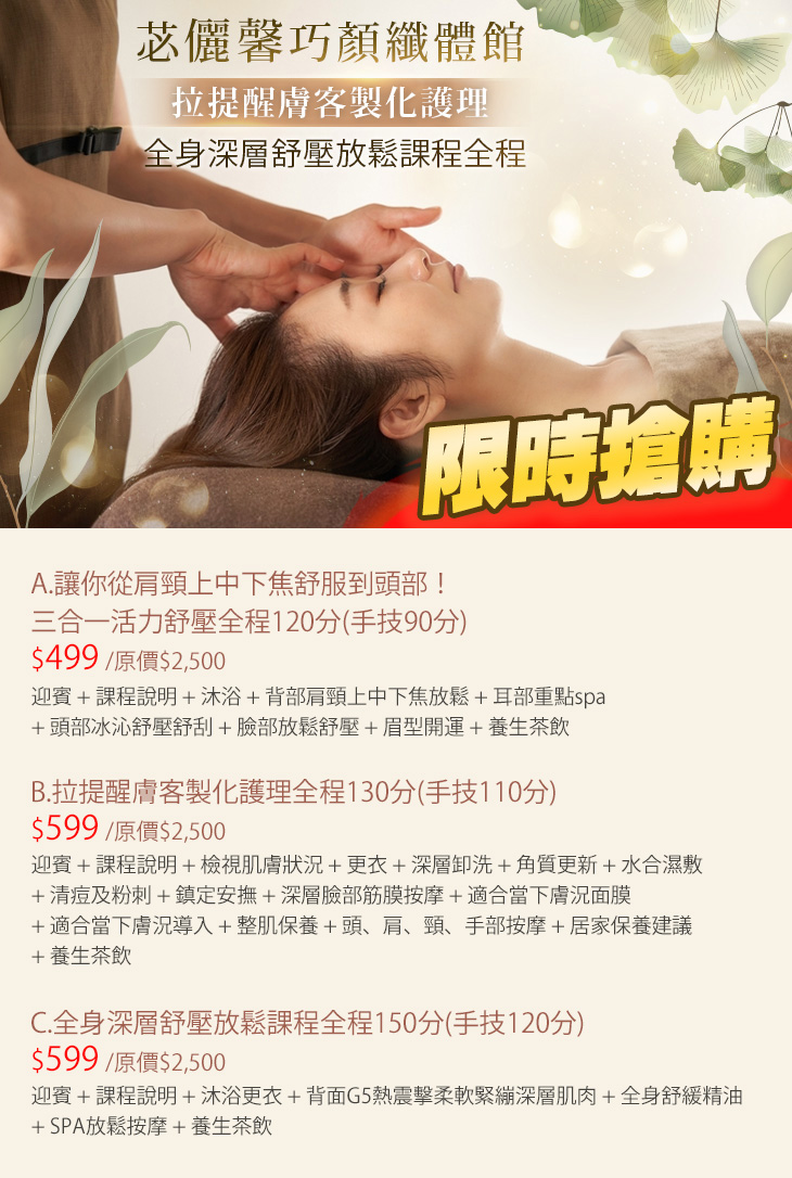 A.讓你從肩頸上中下焦舒服到頭部!三合一活力舒壓全程120分(手技90分) / B.拉提醒膚客製化護理全程130分(手技110分) / C.全身深層舒壓放鬆課程全程150分(手技120分)