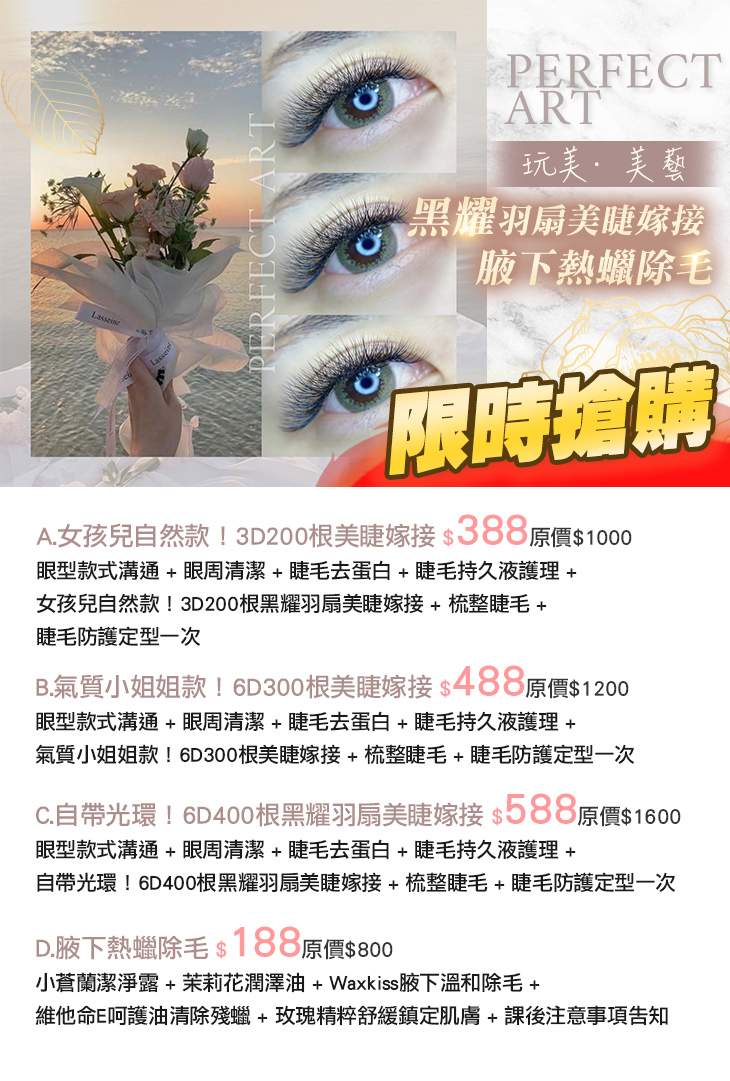 A.女孩兒自然款!3D200根美睫嫁接 / B.氣質小姐姐款!6D300根美睫嫁接 / C.自帶光環!6D400根黑耀羽扇美睫嫁接 / D.腋下熱蠟除毛