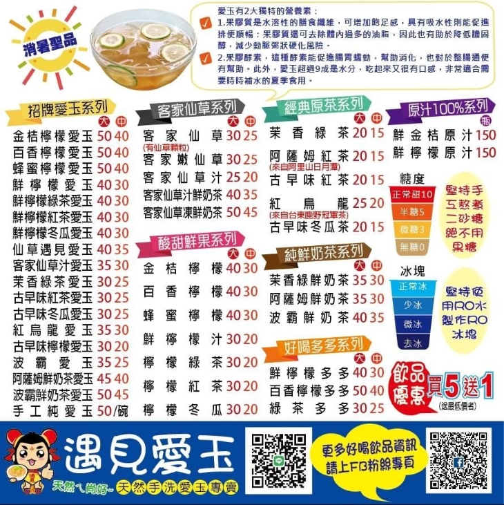 主打天然手洗的愛玉飲品,【遇見愛玉】要讓您品味愛玉最天然、純粹的美味!晶瑩剔透的愛玉,冰心沁涼的滋味十分彈嫩,淡淡的檸檬清香,讓整體十分爽口!除了原味愛玉之外,更有以愛玉為主角所調製的各種風味愛玉任您欽選,深度探索愛玉的魅力!此外,店家也提供仙草、果茶、奶茶、純茶等特調手搖,讓您除了愛玉之外,也能品味不同的美好~