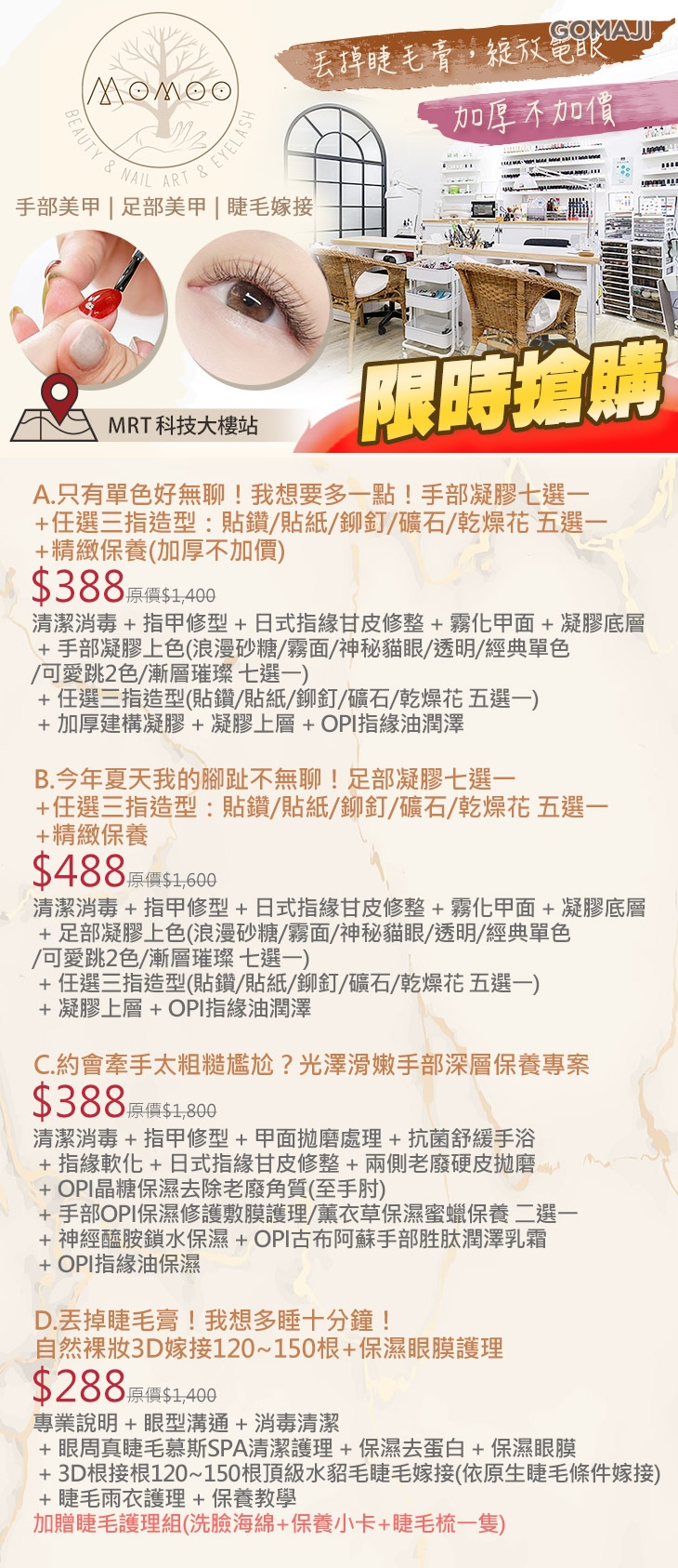 A.只有單色好無聊!我想要多一點!手部凝膠七選一+任選三指造型:貼鑽/貼紙/鉚釘/礦石/乾燥花 五選一+精緻保養(加厚不加價) / B.今年夏天我的腳趾不無聊!足部凝膠七選一+任選三指造型:貼鑽/貼紙/鉚釘/礦石/乾燥花 五選一+精緻保養 / C.約會牽手太粗糙尷尬?光澤滑嫩手部深層保養專案 / D.丟掉睫毛膏!我想多睡十分鐘!自然裸妝3D嫁接120~150根+保濕眼膜護理