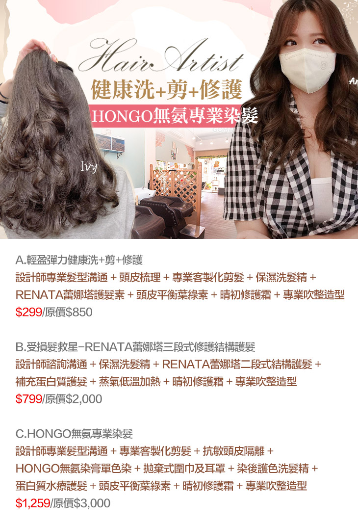 〈設計師專業髮型溝通 + 專業客製化剪髮 + 抗敏頭皮隔離 + HONGO無氨染膏單色染 + 拋棄式圍巾及耳罩 + 染後護色洗髮精 + 蛋白質水療護髮 + 頭皮平衡葉綠素 + 晴初修護霜 + 專業吹整造型〉