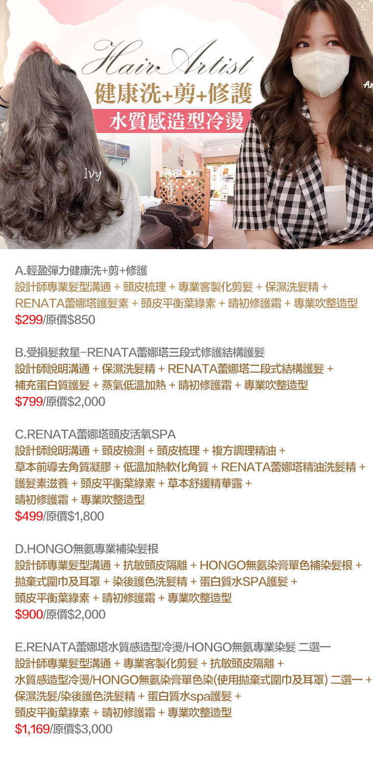 A.輕盈彈力健康洗+剪+修護 / B.受損髮救星-RENATA蕾娜塔三段式修護結構護髮 / C.RENATA蕾娜塔頭皮活氧SPA / D.HONGO無氨專業補染髮根 / E.RENATA蕾娜塔水質感造型冷燙/HONGO無氨專業染髮 二選一