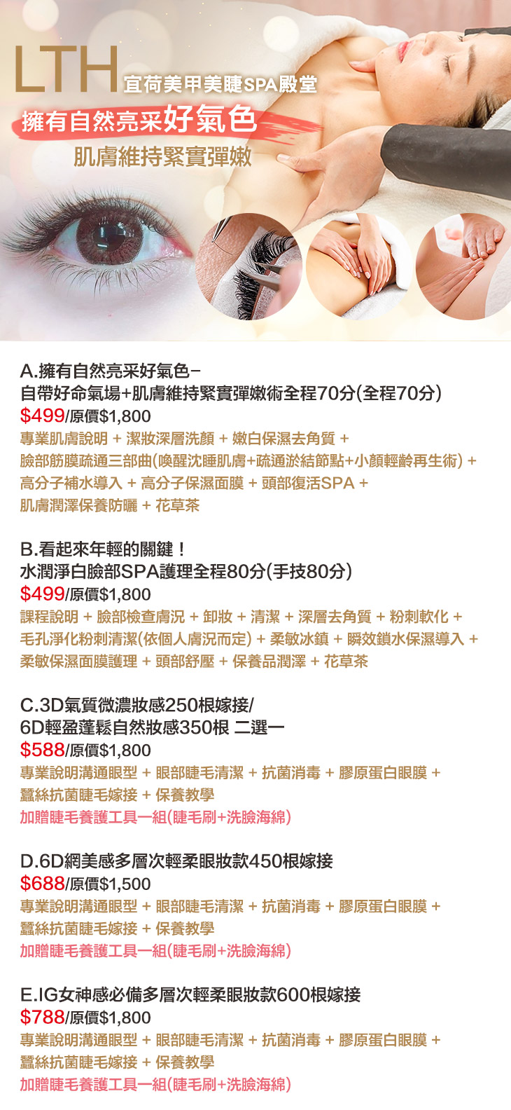 A.擁有自然亮采好氣色-自帶好命氣場+肌膚維持緊實彈嫩術全程70分(全程70分) / B.看起來年輕的關鍵!水潤淨白臉部SPA護理全程80分(手技80分) / C.3D氣質微濃妝感250根嫁接/6D輕盈蓬鬆自然妝感350根 二選一 / D.6D網美感多層次輕柔眼妝款450根嫁接 / E.IG女神感必備多層次輕柔眼妝款600根嫁接