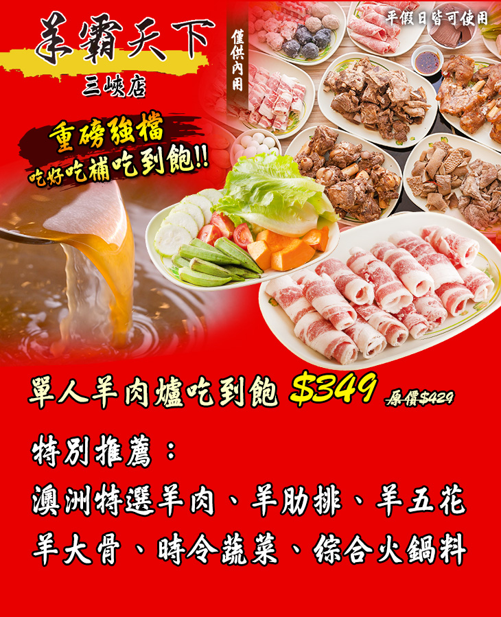 【羊霸天下(三峽店)】舒適寬敞的用餐環境,瀰漫著一股誘人的香氣,琳瑯滿目的各式食材擺滿整個冷藏櫃上,嚴選新鮮羊肉、牛肉、豬肉、時令蔬菜、綜合火鍋料等其他食材,每一樣品質皆是精心挑選,看了都相當令人垂涎,搭配老闆精緻用心熬煮的清燉及藥燉湯底,呈現出絕佳鍋物之風味,多樣豐富食材讓您吃好!吃補!吃到飽!料多實在、物超所質,讓吃過的客人們都大推好評!本次與GOMAJI聯手推出優惠,愛吃羊肉的麻吉們,還在等什麼?趕緊相揪好友們下單吃起來!