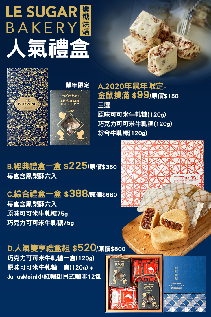 今年新春,就用【LeSugarBakery 樂糖烘焙】精心手製的禮盒,向重要的人問下鼠年第一聲好,為您我久久相聚的精心時刻,點綴不一樣的美好!