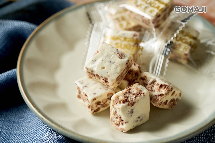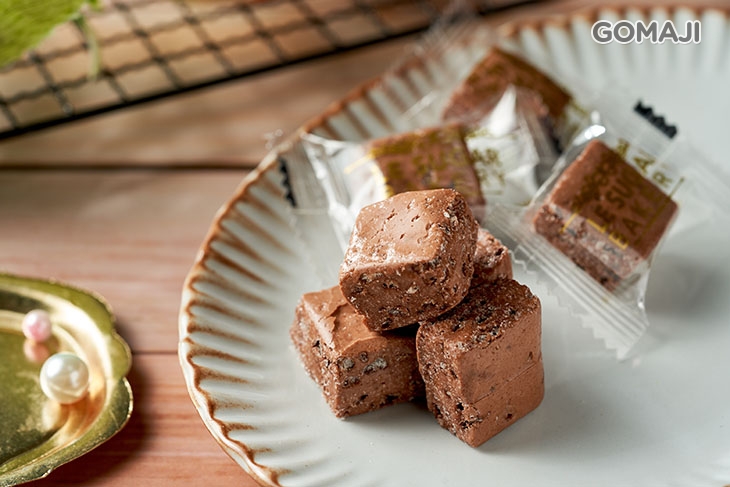 加入法國奶油、濃情可可粉及脆口可可米製成的巧克力可可米牛軋糖,四方端正的一口大小十分好入口,帶有嚼勁與黏性的獨到口感是牛軋糖專屬的魅力!馥郁迷人的可可香在奶油的調和下多了一分溫潤奶香,越是咀嚼、風味越勝!