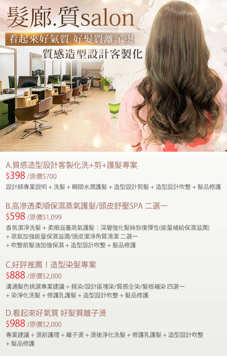 A.質感造型設計客製化洗+剪+護髮專案 / B.高滲透柔順保濕蒸氣護髮/頭皮舒壓SPA 二選一 / C.好評推薦!造型染髮專案 / D.看起來好氣質 好髮質離子燙