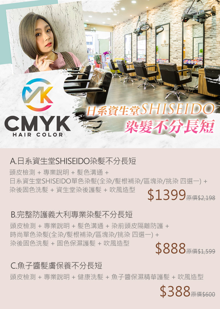 A.日系資生堂SHISEIDO染髮不分長短 / B.完整防護義大利專業染髮不分長短 / C.魚子醬髮膚保養不分長短