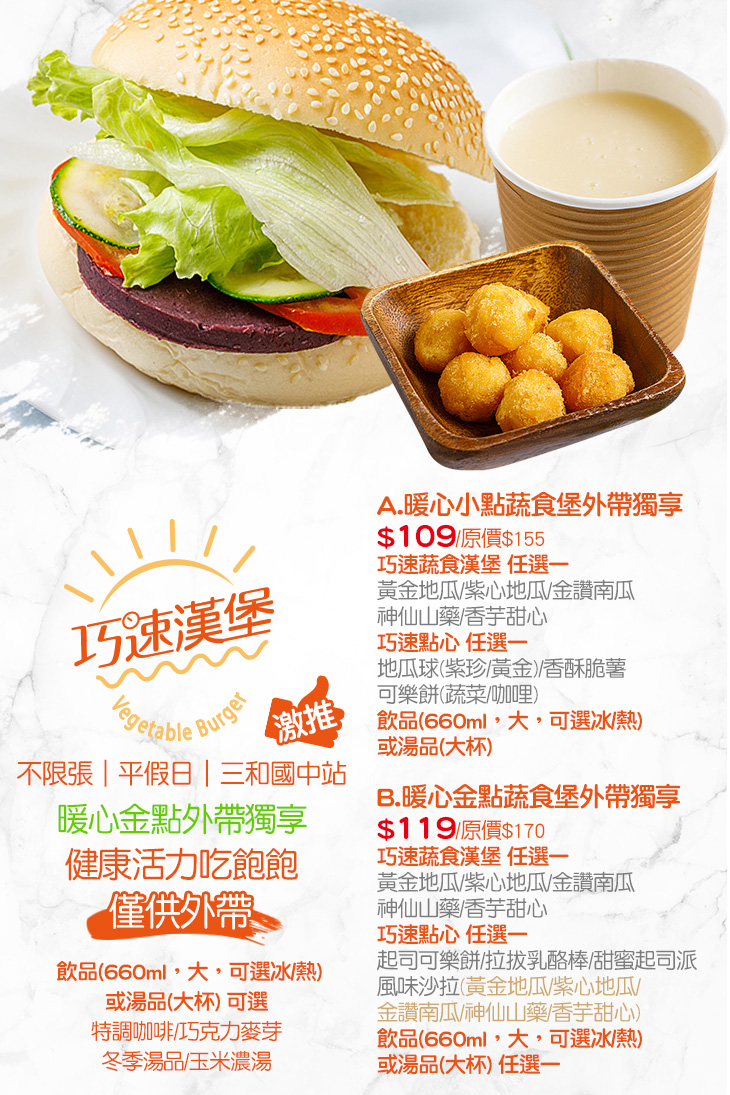 〈巧速蔬食漢堡:黃金地瓜/紫心地瓜/金讚南瓜/神仙山藥/香芋甜心 任選一 + 巧速點心:地瓜球(紫珍/黃金)/香酥脆薯/可樂餅(蔬菜/咖哩) 任選一 + 飲品(660ml,大,可選冰/熱)或湯品(大杯):特調咖啡/巧克力麥芽/冬季湯品/玉米濃湯 任選一〉