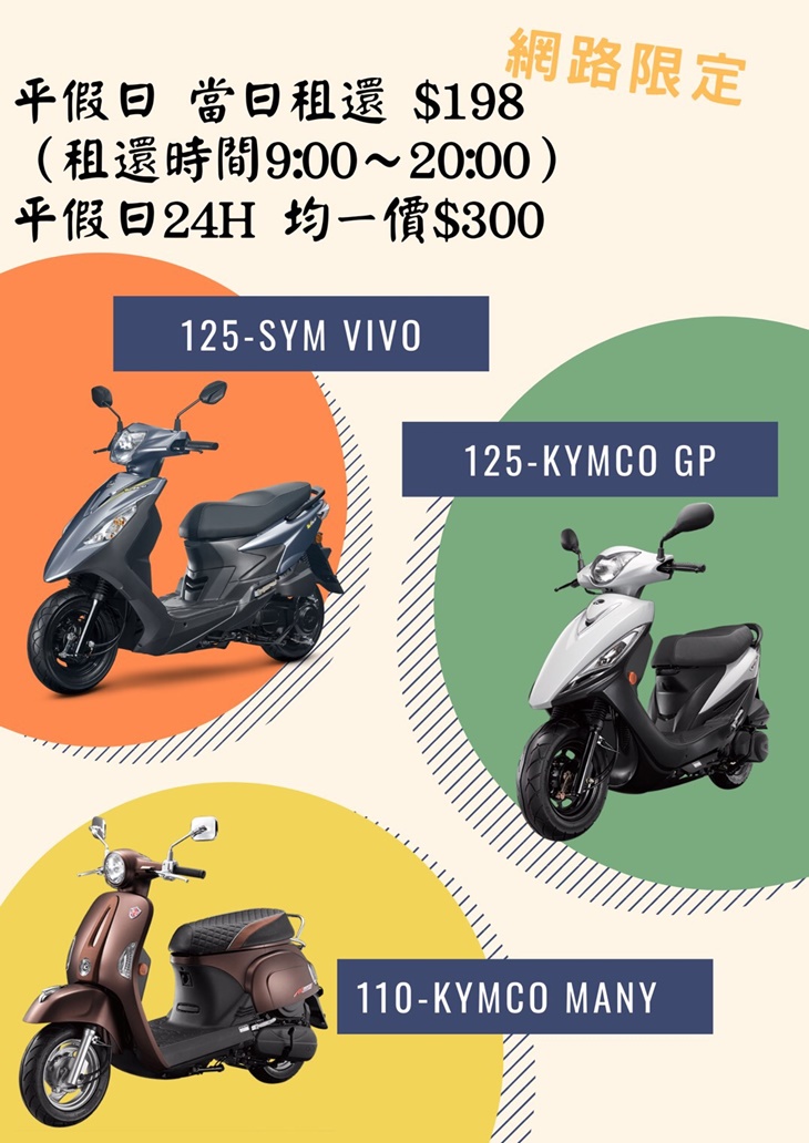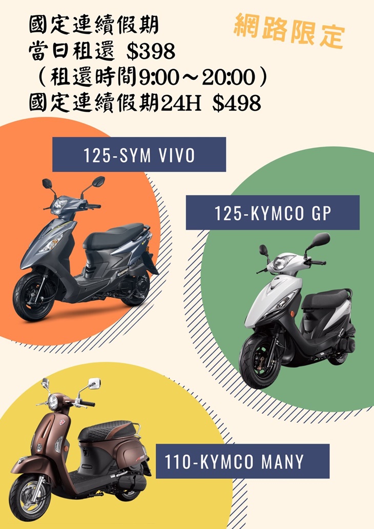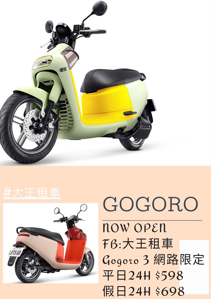 F.GOGORO電動車不限哩程數週六、週日、國定假日及連續假日(當日)使用24H