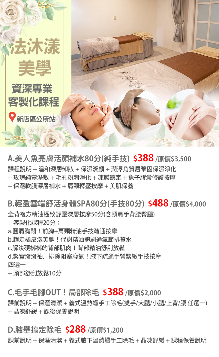 A.美人魚亮膚活顏補水80分(純手技) / B.輕盈雲端舒活身體SPA80分(手技80分) / C.毛手毛腳OUT!局部除毛 / D.腋舉搞定除毛