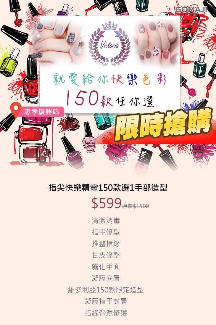 〈清潔消毒 + 指甲修型 + 推整指緣 + 甘皮修整 + 霧化甲面 + 凝膠底層 + 維多利亞150款限定造型 + 凝膠指甲封層 + 指緣保濕修護〉