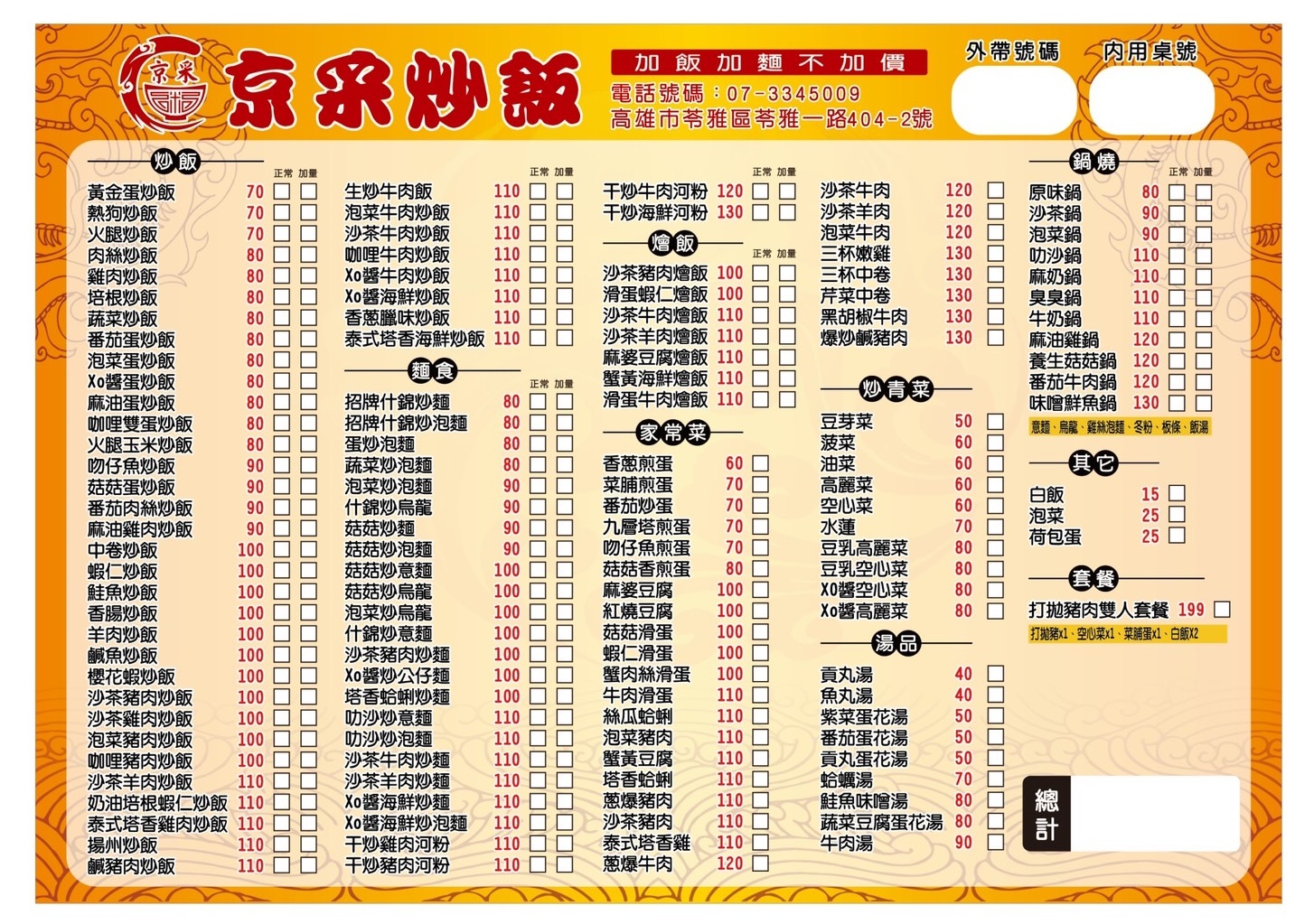 炒得粒粒分明的炒飯、料多實在、噴香美味,一直都是讓人難以抵擋的經典佳餚!【京采炒飯】主打選擇豐富的炒飯料理,多樣的口味,讓您天天去吃也不會膩!嚴選食材、新鮮現炒,那一道又一道趁熱上菜的快炒美味,不僅將食材天然的滋味發揮得淋漓盡致,更充分展現主廚的功夫手藝唷!