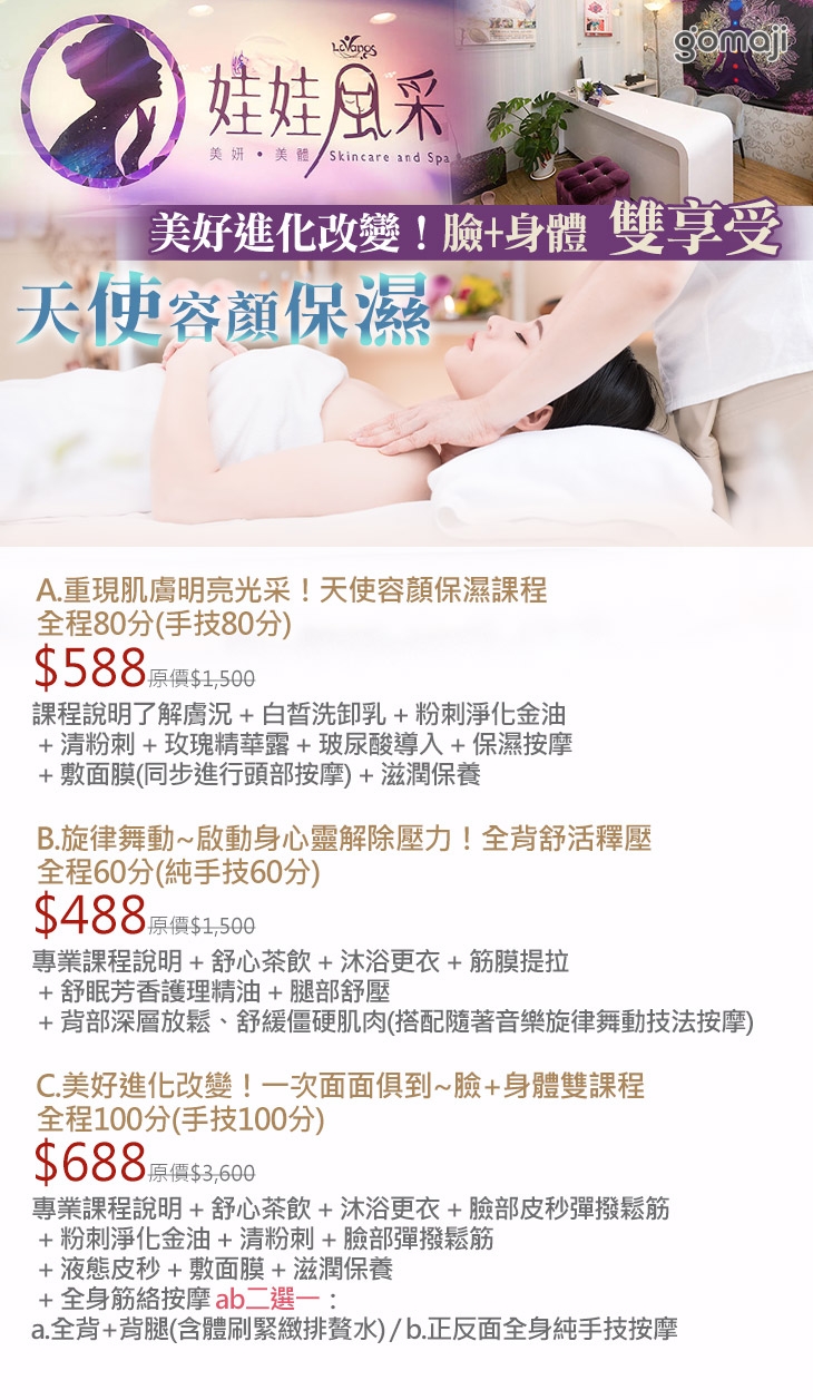 A.重現肌膚明亮光采!天使容顏保濕課程全程80分(手技80分) / B.旋律舞動~啟動身心靈解除壓力!全背舒活釋壓全程60分(純手技60分) / C.美好進化改變!一次面面俱到~臉+身體雙課程全程100分(手技100分)