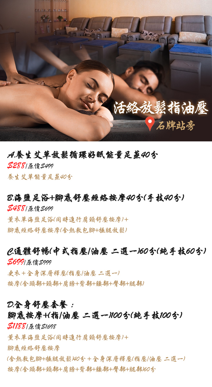 近捷運石牌站,您舒壓放鬆的最新選擇!特別聘請手藝專精、技術深厚的按摩師傅群,堅強的陣容,為您釋放平時累積已久的壓力與疲勞~寬敞舒適的環境、專業的課程、頂級的產品、充滿力道的手藝…不勝枚舉的優點為您勾勒出完美的體驗,有口皆碑的用心服務,絕對給您最幸福的享受!