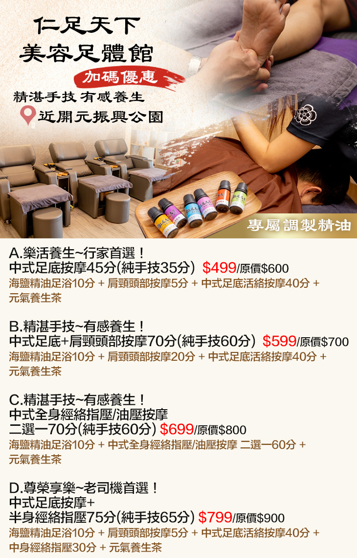 與一般坊間不同,【仁足天下美容足體館】專業調製專屬的按摩精油,頂級滋養的成份、放鬆舒緩的香氛,為每一位疲勞的來客悉心緩解痠痛,卸除連日累積的壓力與煩憂,帶來幸福至極的寵愛~