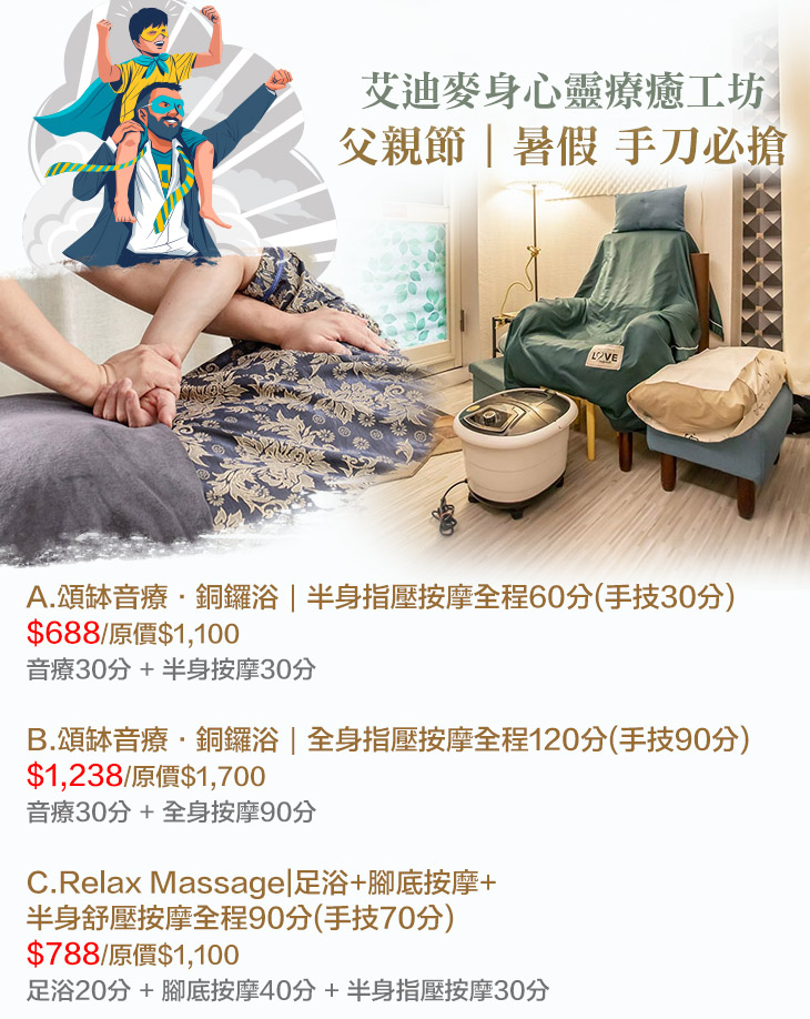A.頌缽音療·銅鑼浴|半身指壓按摩全程60分(手技30分) / B.頌缽音療·銅鑼浴|全身指壓按摩全程120分(手技90分) / C.Relax Massage|足浴+腳底按摩+半身舒壓按摩全程90分(手技70分)