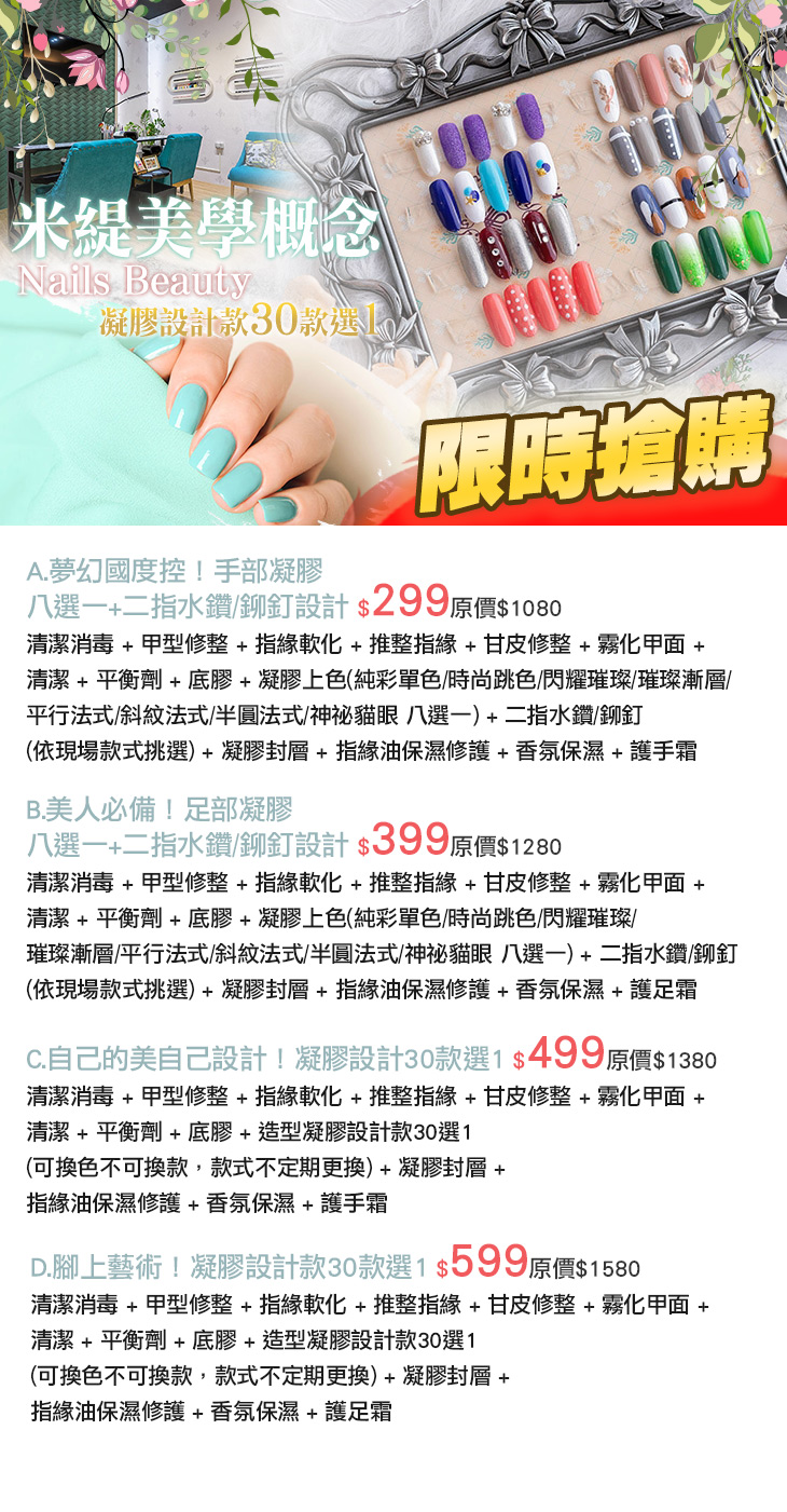 A.夢幻國度控!手部凝膠八選一+二指水鑽/鉚釘設計 / B.美人必備!足部凝膠八選一+二指水鑽/鉚釘設計 / C.自己的美自己設計!凝膠設計30款選1 / D.腳上藝術!凝膠設計款30款選1