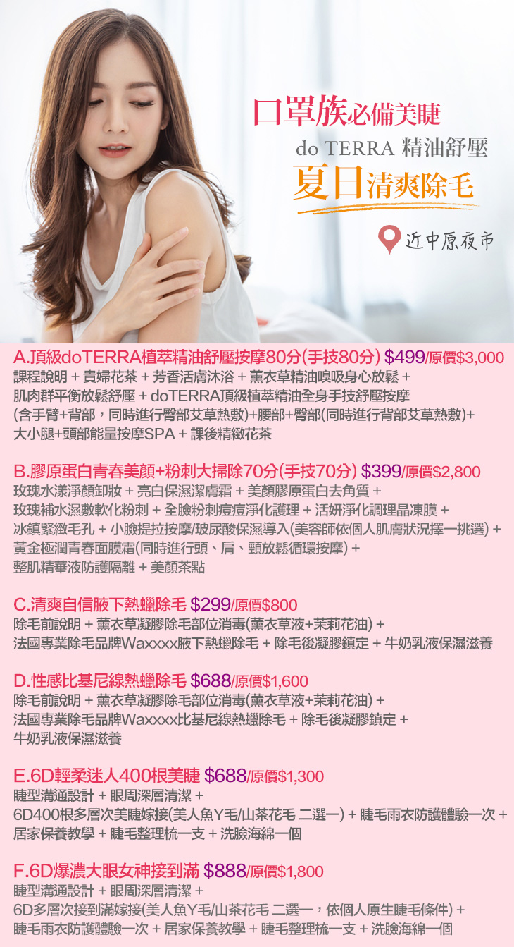 A.頂級doTERRA植萃精油舒壓按摩80分(手技80分) / B.膠原蛋白青春美顏+粉刺大掃除70分(手技70分) / C.清爽自信腋下熱蠟除毛 / D.性感比基尼線熱蠟除毛 / E.6D輕柔迷人400根美睫 / F.6D爆濃大眼女神接到滿