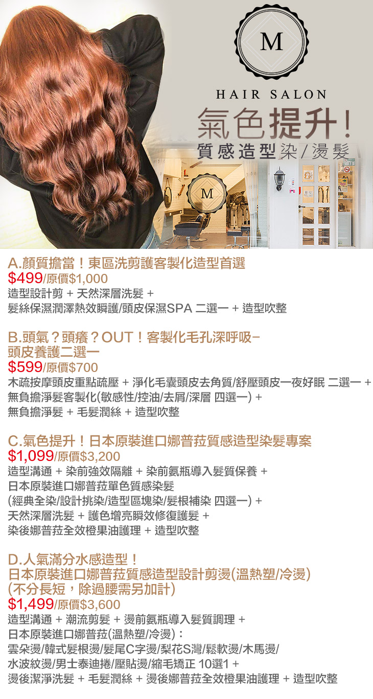 A.顏質擔當!東區洗剪護客製化造型首選 / B.頭氣?頭癢?OUT!客製化毛孔深呼吸-頭皮養護二選一 / C.氣色提升!日本原裝進口娜普菈質感造型染髮專案 / D.人氣滿分水感造型!日本原裝進口娜普菈質感造型設計剪燙(溫熱塑/冷燙)(不分長短,除過腰需另加計)