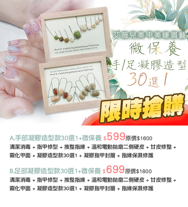 〈清潔消毒 + 指甲修型 + 推整指緣 + 溫和電動拋磨二側硬皮 + 甘皮修整 + 霧化甲面 + 凝膠造型款30選1 + 凝膠指甲封層 + 指緣保濕修護〉