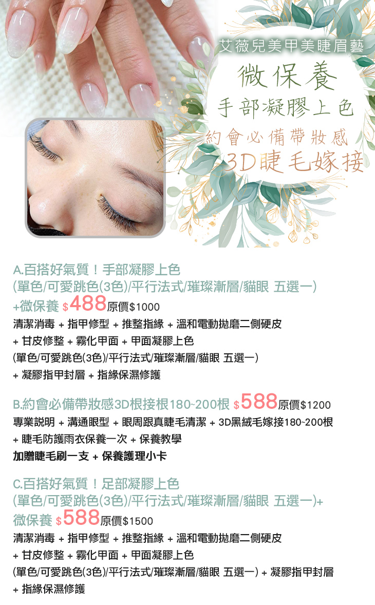 A.百搭好氣質!手部凝膠上色(單色/可愛跳色(3色)/平行法式/璀璨漸層/貓眼 五選一)+微保養 / B.約會必備帶妝感3D根接根180~200根 / C.百搭好氣質!足部凝膠上色(單色/可愛跳色(3色)/平行法式/璀璨漸層/貓眼 五選一)+微保養