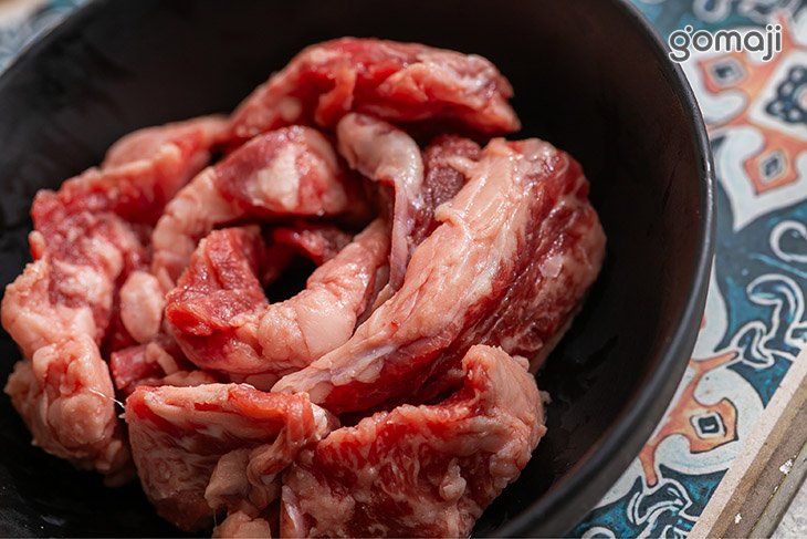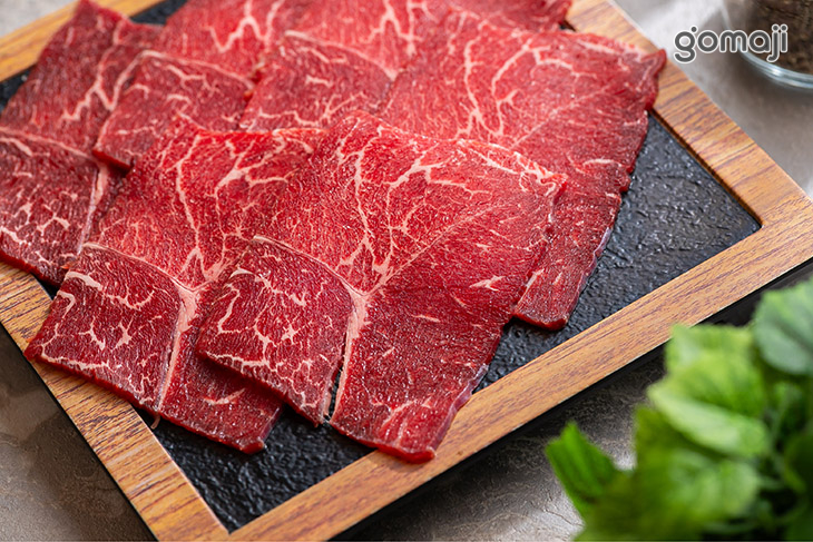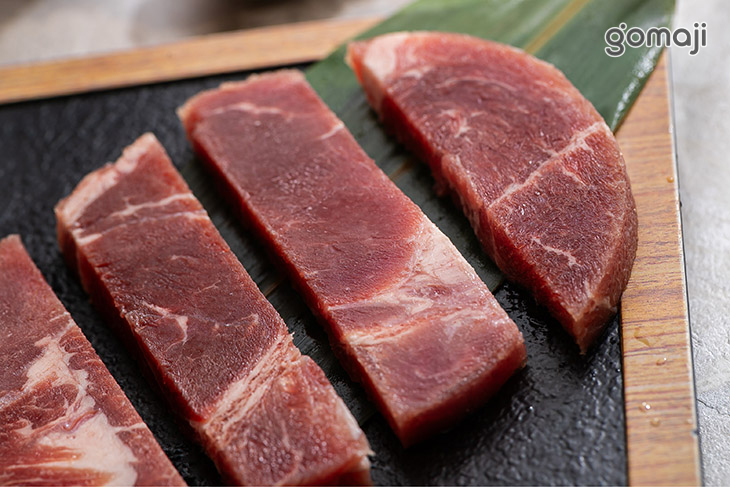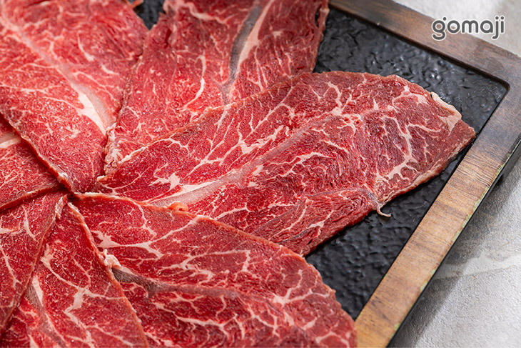 大片牛肉如花朵般綻放於黑色石板上,細緻油花均勻分佈,紅潤肉色與乳白脂肪交織出迷人紋理,是只有高等級 M9 和牛才有的華麗光澤。肩胛蓋肉位於活動度適中部位,兼具油脂與肉感,入口先是油香在舌尖緩緩化開,隨後帶出濃郁牛肉甜味與豐富層次。不論單吃或搭配蔬菜,都能感受到軟嫩多汁又不失咬勁的口感,是愛牛肉饕客必點的頂級部位。