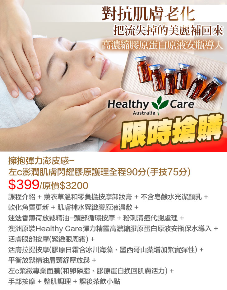 〈課程介紹 + 薰衣草溫和零負擔按摩卸妝膏 + 不含皂鹼水光潔顏乳 + 軟化角質更新 + 肌膚補水緊緻膠原液濕敷 + 迷迭香薄荷放鬆精油-頭部循環按摩 + 粉刺清痘代謝處理 + 澳洲原裝Healthy Care彈力精靈高濃縮膠原蛋白原液安瓶保水導入 + 活膚眼部按摩(緊緻眼周霜) + 活膚拉提按摩 + 平衡放鬆精油肩頸舒壓放鬆 + 左c緊緻專業面膜 + 手部按摩+整肌調理+課後茶飲小點〉