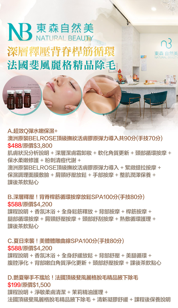 A.超效Q彈水嫩保濕+澳洲原裝BELROSE頂級撫紋活膚膠原彈力導入共90分(手技70分) / B.深層釋壓!背脊桿筋循環按摩放鬆SPA100分(手技80分) / C.夏日來襲!美體體雕曲線SPA100分(手技80分) / D.艷夏舉手不尷尬!法國頂級斐風麗格脫毛精品腋下除毛