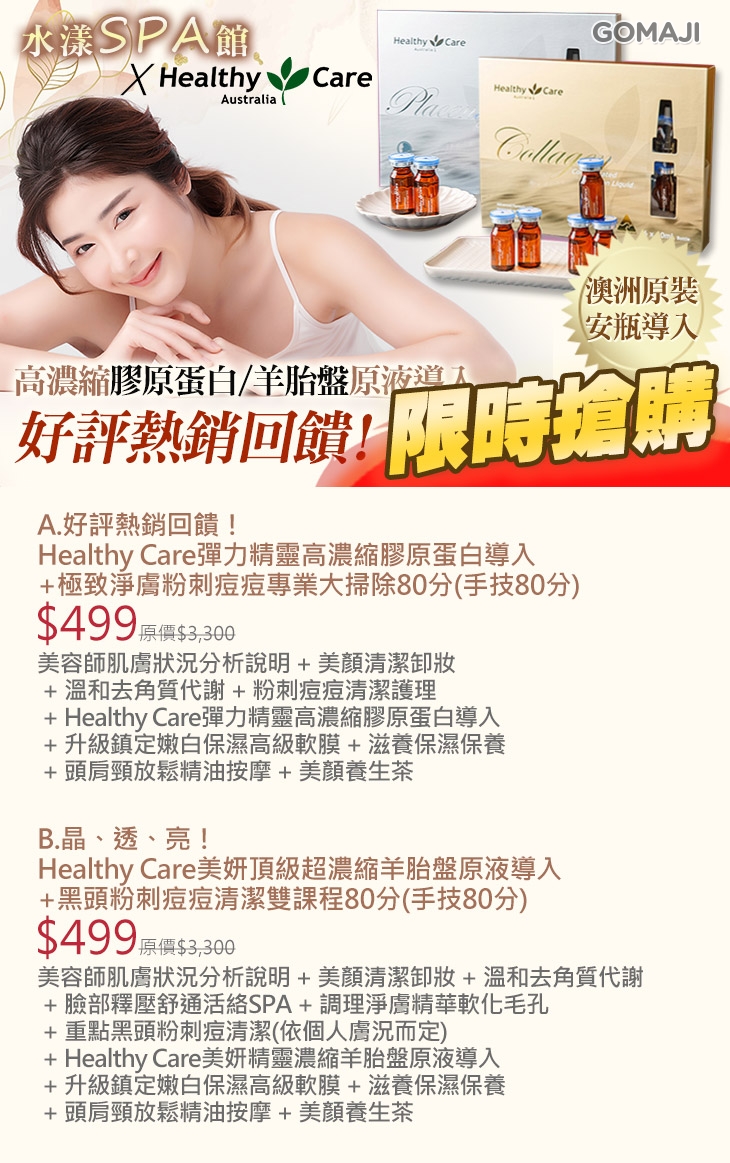 A.好評熱銷回饋!Healthy Care彈力精靈高濃縮膠原蛋白導入+極致淨膚粉刺痘痘專業大掃除80分(手技80分) / B.晶、透、亮!Healthy Care美妍頂級超濃縮羊胎盤原液導入+黑頭粉刺痘痘清潔雙課程80分(手技80分)