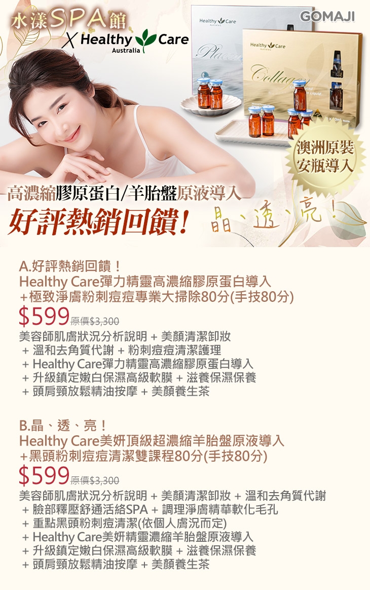 A.好評熱銷回饋!Healthy Care彈力精靈高濃縮膠原蛋白導入+極致淨膚粉刺痘痘專業大掃除80分(手技80分) / B.晶、透、亮!Healthy Care美妍頂級超濃縮羊胎盤原液導入+黑頭粉刺痘痘清潔雙課程80分(手技80分)