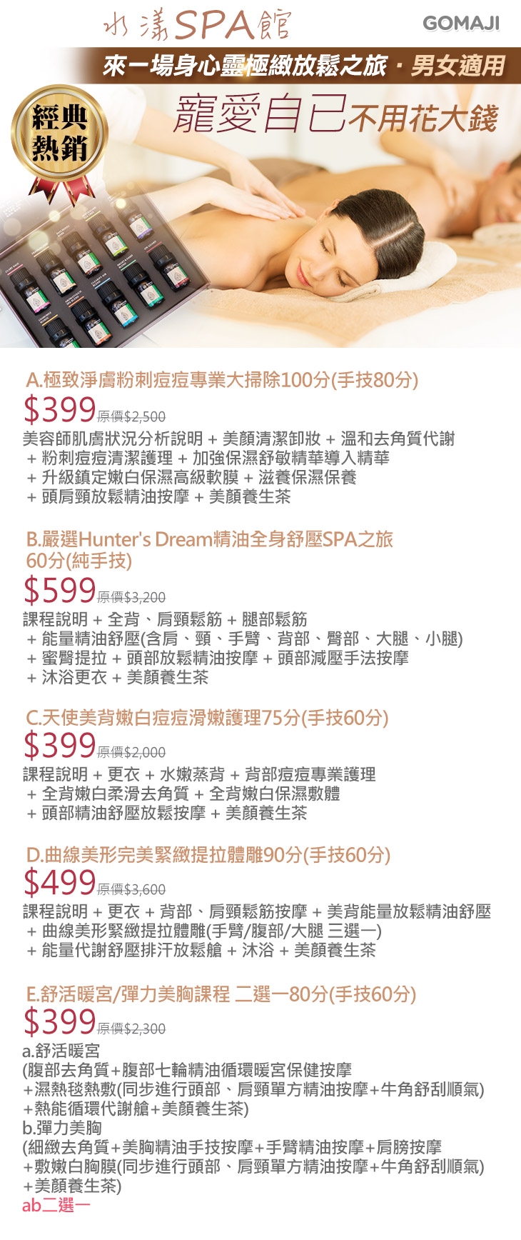 A.極致淨膚粉刺痘痘專業大掃除100分(手技80分) / B.嚴選Hunter's Dream精油全身舒壓SPA之旅60分(純手技) / C.天使美背嫩白痘痘滑嫩護理75分(手技60分) / D.曲線美形完美緊緻提拉體雕90分(手技60分) / E.舒活暖宮/彈力美胸課程 二選一80分(手技60分)
