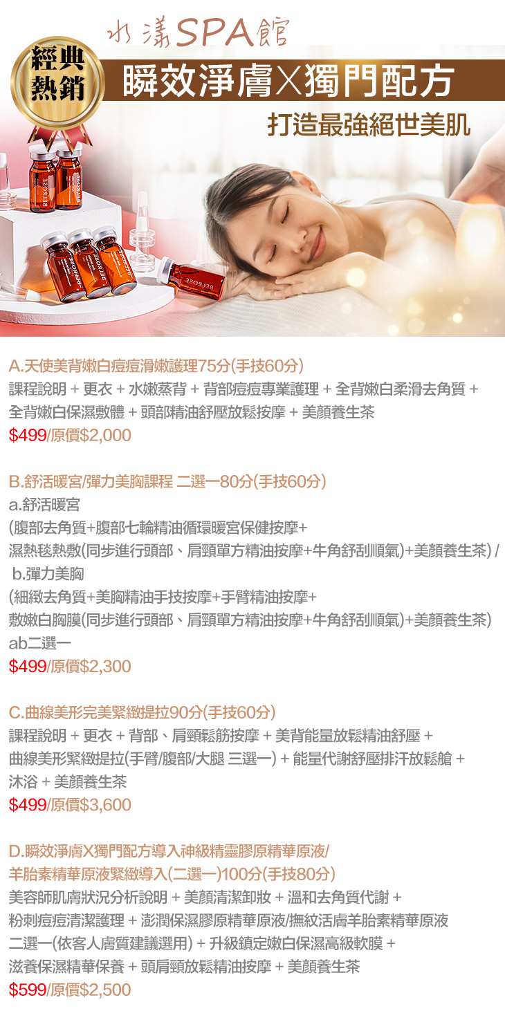 A.天使美背嫩白痘痘滑嫩護理75分(手技60分) / B.舒活暖宮/彈力美胸課程 二選一80分(手技60分) / C.曲線美形完美緊緻提拉90分(手技60分) / D.瞬效淨膚X獨門配方導入神級精靈膠原精華原液/羊胎素精華原液緊緻導入(二選一)100分(手技80分)