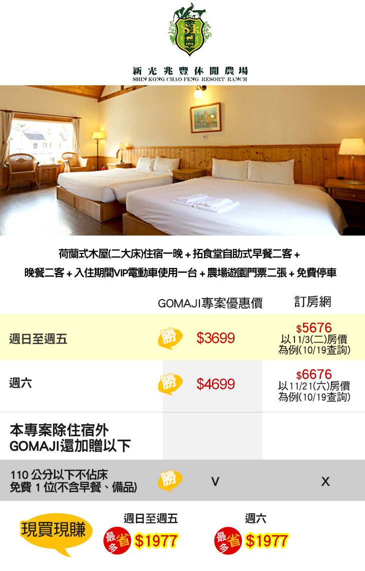 ★ 雙人一泊二食(早餐+晚餐+VIP電動車入住期間使用+門票)入住荷蘭式木屋二大床房型,可彈性加人加價入住!開著電動車暢玩園區更方便!