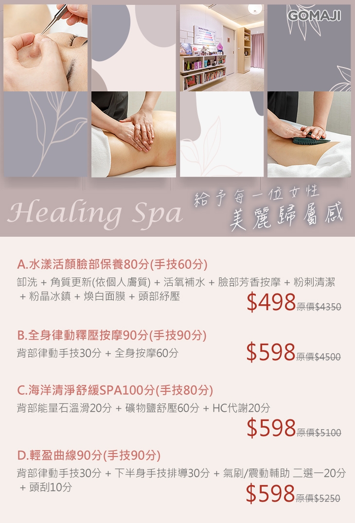 溫馨、舒適的環境搭配上美容師親切的服務態度,讓人一走進就卸下原有的緊繃感。Healing Spa提供專業的技術、平易近人的價格,讓您體驗高貴不貴的享受,唯有日常重視保養,才能讓自己在時間的淬鍊下依舊美麗動人,時時刻刻都綻放最柔美的光采!