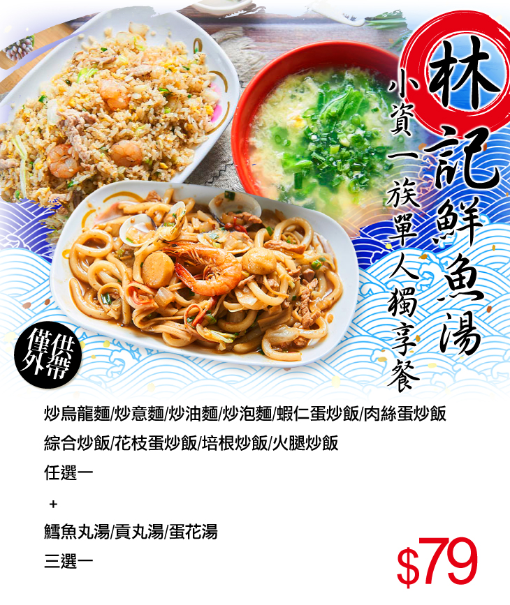 〈炒烏龍麵/炒意麵/炒油麵/炒泡麵/蝦仁蛋炒飯/肉絲蛋炒飯/綜合炒飯/花枝蛋炒飯/培根炒飯/火腿炒飯 任選一 + 鱈魚丸湯/貢丸湯/蛋花湯 三選一〉
