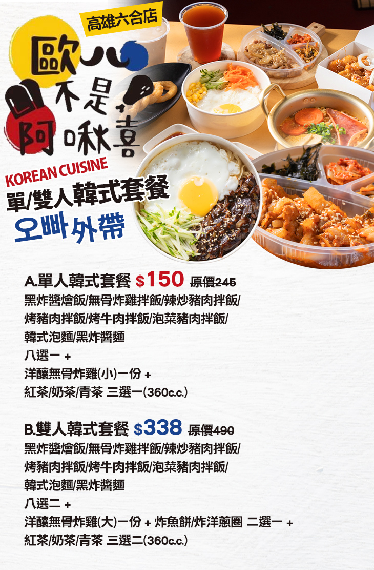 〈黑炸醬燴飯/無骨炸雞拌飯/辣炒豬肉拌飯/烤豬肉拌飯/烤牛肉拌飯/泡菜豬肉拌飯/韓式泡麵/黑炸醬麵 八選一 + 洋釀無骨炸雞(小)一份 + 紅茶/奶茶/青茶 三選一