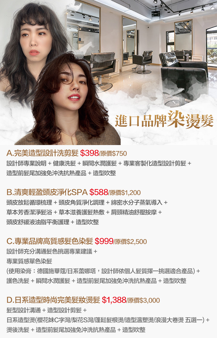 A.完美造型設計洗剪髮 / B.清爽輕盈頭皮淨化SPA / C.專業品牌高質感髮色染髮 / D.日系造型時尚完美髮妝燙髮