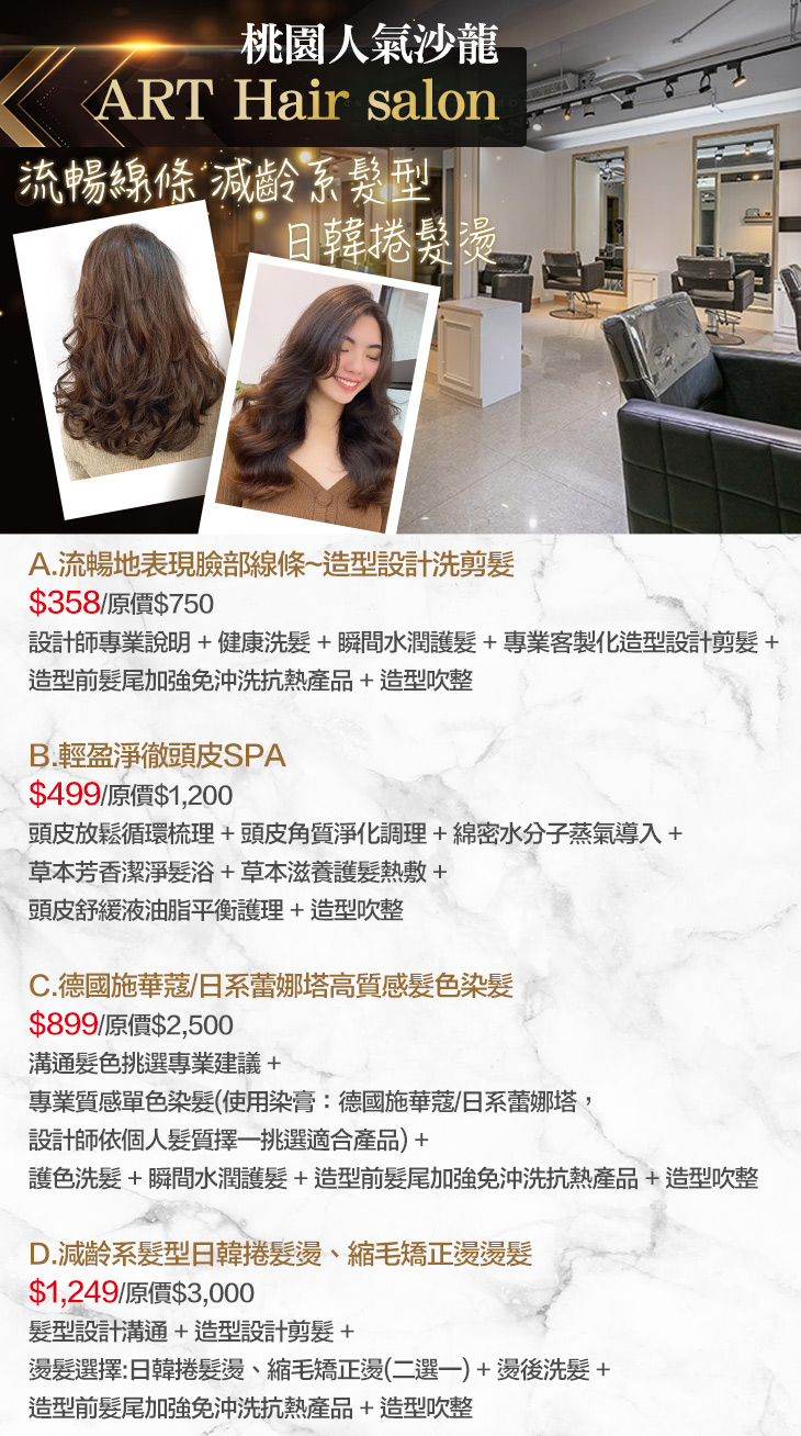 A.流暢地表現臉部線條~造型設計洗剪髮 / B.輕盈淨徹頭皮SPA / C.德國施華蔻/日系蕾娜塔高質感髮色染髮 / D.減齡系髮型日韓捲髮燙、縮毛矯正燙燙髮