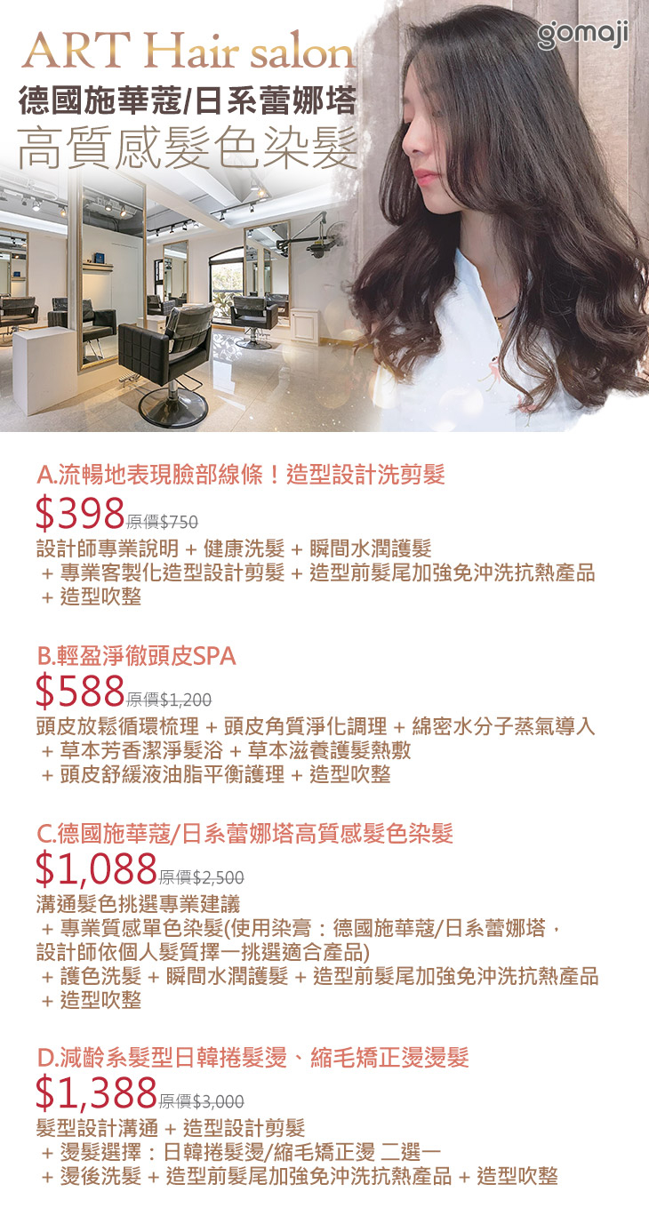 A.流暢地表現臉部線條!造型設計洗剪髮 / B.輕盈淨徹頭皮SPA / C.德國施華蔻/日系蕾娜塔高質感髮色染髮 / D.減齡系髮型日韓捲髮燙、縮毛矯正燙燙髮