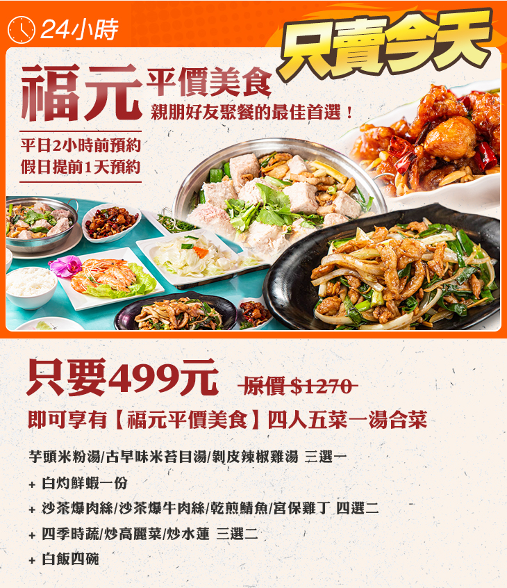 食材新鮮、料多實在、物美價廉,深藏不露的平價美食!讓您用最實惠的價格,就能品嚐到美味又豐盛的家常菜餚,絕對會是您與親朋好友聚餐的最佳首選!用餐環境寬敞舒適,讓人不自覺地著迷在【福元平價美食】的澎湃的料理、親切的服務、放鬆的氛圍裡!快點再它爆紅以前,趁著這次與夠麻吉攜手推出的超值好康,相揪親友們一同來嚐鮮享用!