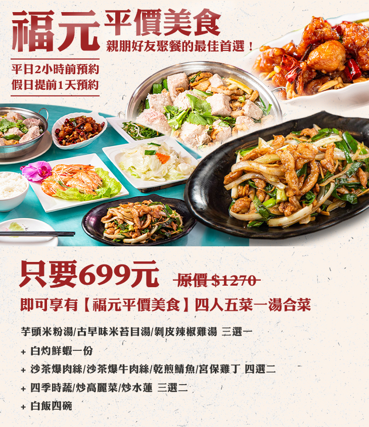 食材新鮮、料多實在、物美價廉,深藏不露的平價美食!讓您用最實惠的價格,就能品嚐到美味又豐盛的家常菜餚,絕對會是您與親朋好友聚餐的最佳首選!用餐環境寬敞舒適,讓人不自覺地著迷在【福元平價美食】的澎湃的料理、親切的服務、放鬆的氛圍裡!快點再它爆紅以前,趁著這次與夠麻吉攜手推出的超值好康,相揪親友們一同來嚐鮮享用!