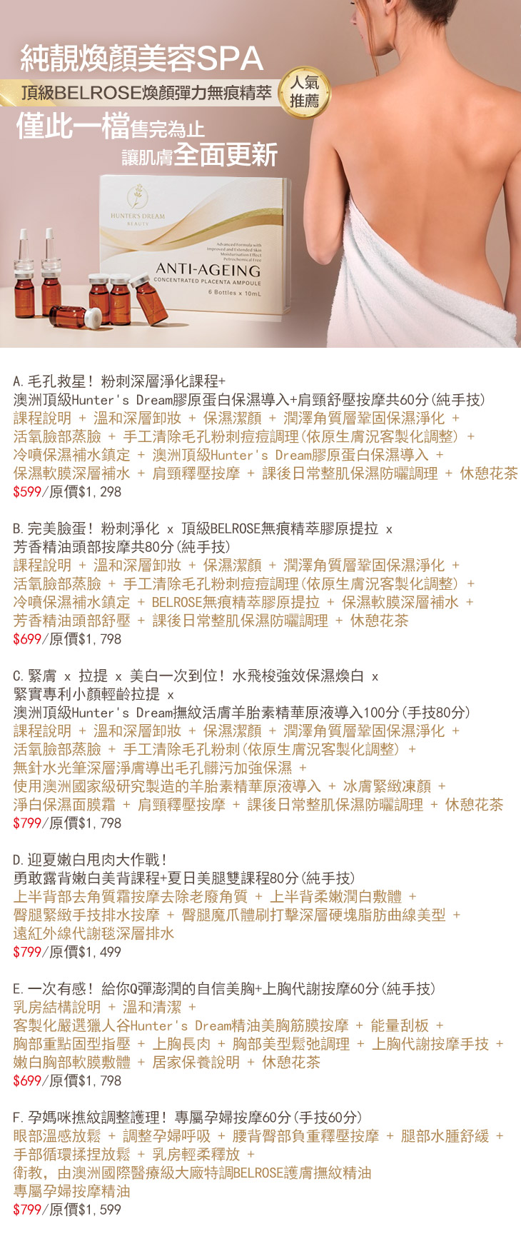 A粉刺深層淨化課程+澳洲頂級Hunter's Dream保濕導入+肩頸舒壓按摩共60分(純手技)/B.粉刺淨化 x 頂級BELROSE無痕精萃膠原提拉 x 芳香精油頭部按摩共80分(純手技)/C.水飛梭強效保濕煥白 x 緊實專利小顏輕齡拉提 x 澳洲頂級Hunter's Dream撫紋活膚羊胎素精華原液導入100分(手技80分)/D.勇敢露背嫩白美背課程+夏日美腿雙課程80分(純手技)/E.給你Q彈澎潤的自信美胸+上胸代謝按摩60分/F.專屬孕婦按摩60分