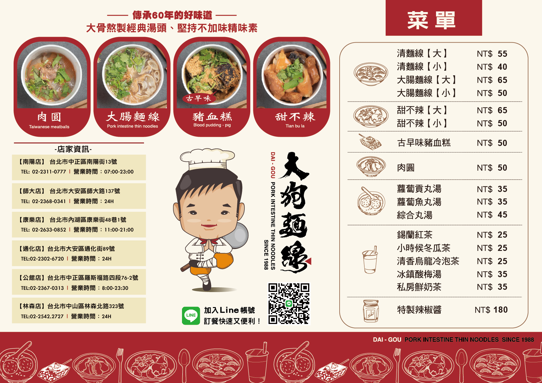 傳承了數十年的好味道~【大狗麵線】,主打濃稠、香濃的麵線糊,道地、古早的口味,讓您一品正宗的台灣味!菜單上另外還有肉圓、甜不辣、豬血糕…等台式小吃可以選擇,彷彿將台灣街頭最經典的小吃皆濃縮於此,讓您一站便能享盡台式美味~台灣人,果然還是要吃台灣菜!