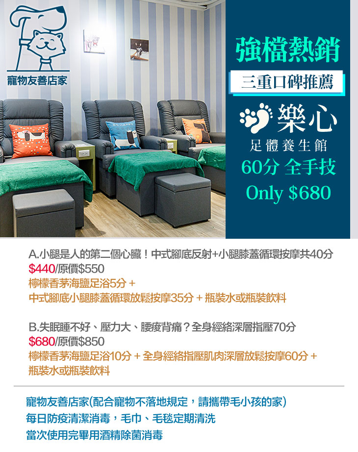 當您甫入【樂心】,有別於一般足體養生館的溫馨裝潢絕對會緊緊吸引您的眼球!充滿溫度的木質調地板,搭配配色輕盈,略帶童心的裝潢,勾勒出幸福滿滿的空間!專業又親切的服務,讓您感受一見如故的暖心~以服務至上的宗旨,無微不至地照料疲勞的您,讓您在此體會前所未有的放鬆享受~當生活忙碌,讓人喘不過氣,【樂心】就是您最好的活力補給站與心靈休憩站!