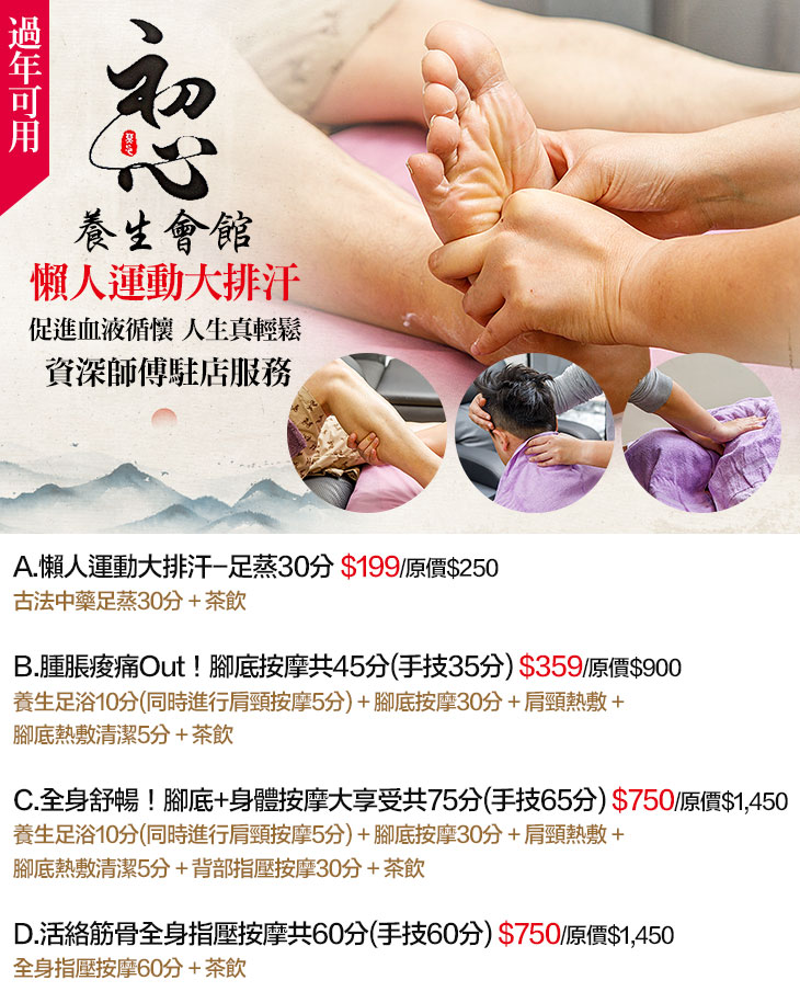 A.懶人運動大排汗-足蒸30分 / B.腫脹痠痛Out!腳底按摩共45分(手技35分) / C.全身舒暢!腳底+身體按摩大享受共75分(手技65分) / D.活絡筋骨全身指壓按摩共60分(手技60分)
