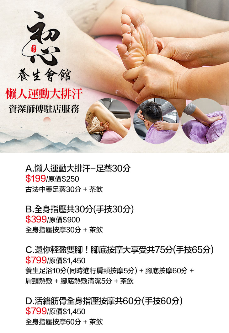A.懶人運動大排汗-足蒸30分 / B.全身指壓共30分(手技30分) / C.還你輕盈雙腳!腳底按摩大享受共75分(手技65分) / D.活絡筋骨全身指壓按摩共60分(手技60分)