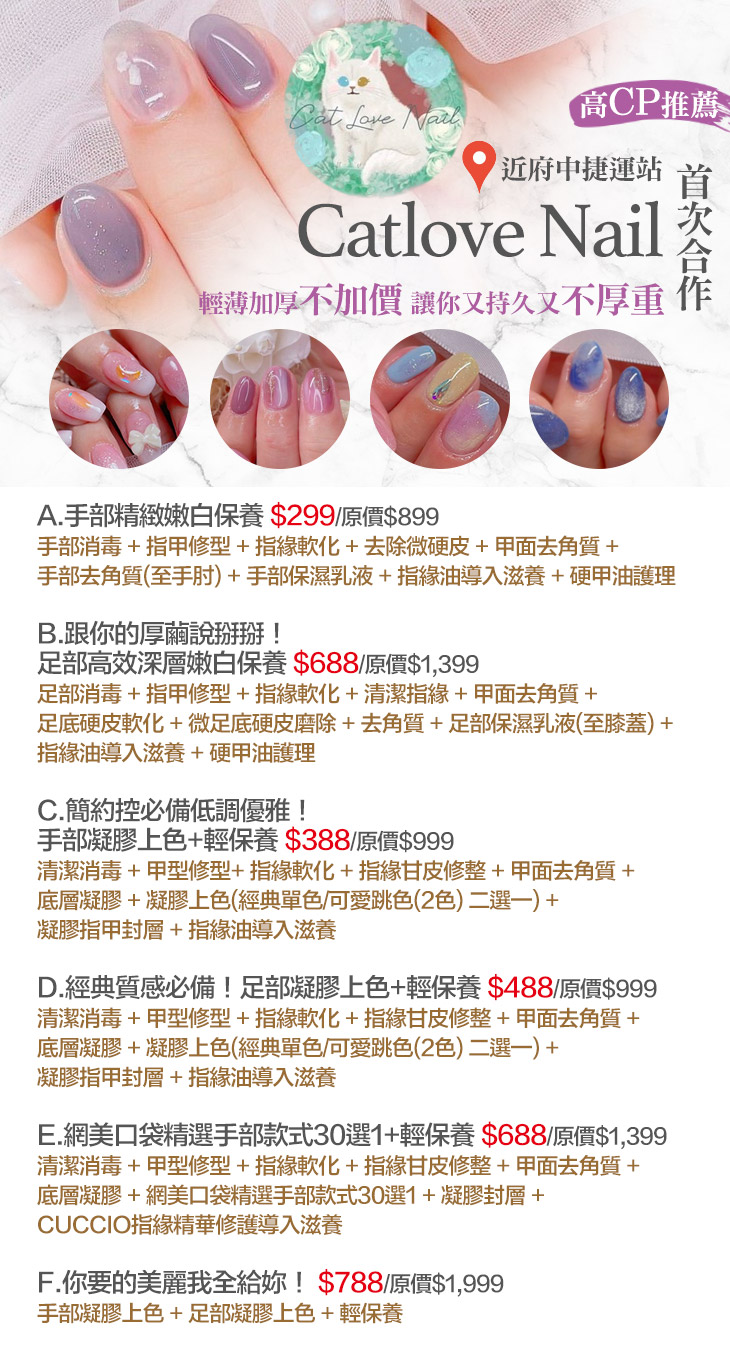 A.手部精緻嫩白保養 / B.跟你的厚繭說掰掰!足部高效深層嫩白保養 / C.簡約控必備低調優雅!手部凝膠上色+輕保養 / D.經典質感必備!足部凝膠上色+輕保養 / E.網美口袋精選手部款式30選1+輕保養 / F.你要的美麗我全給妳!