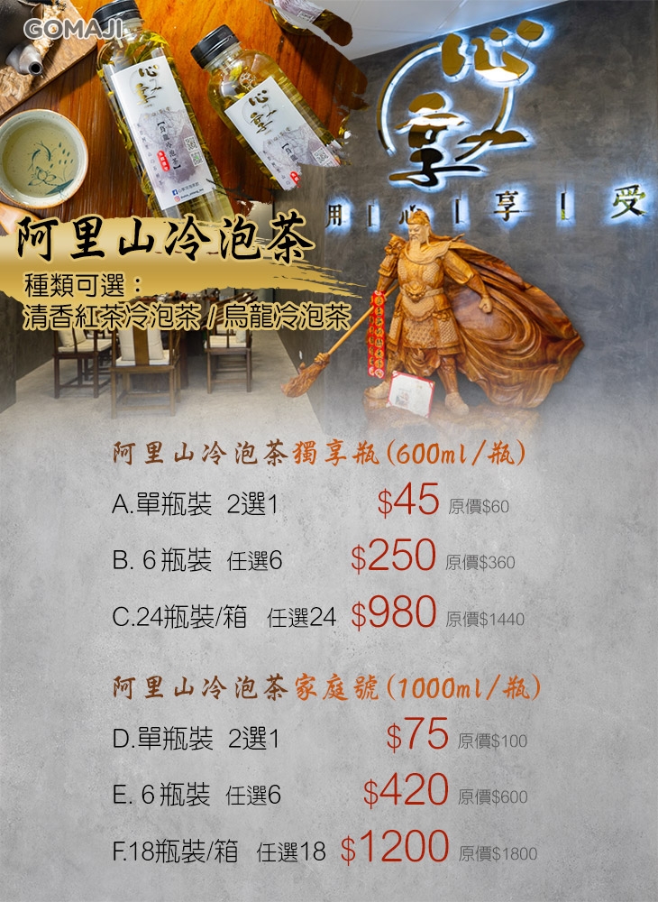 A.阿里山冷泡茶獨享瓶(單瓶裝) / B.阿里山冷泡茶獨享瓶(6瓶裝) / C.阿里山冷泡茶獨享瓶(24瓶裝/箱) / D.阿里山冷泡茶家庭號(單瓶裝) / E.阿里山冷泡茶家庭號(6瓶裝) / F.阿里山冷泡茶家庭號(18瓶裝/箱)